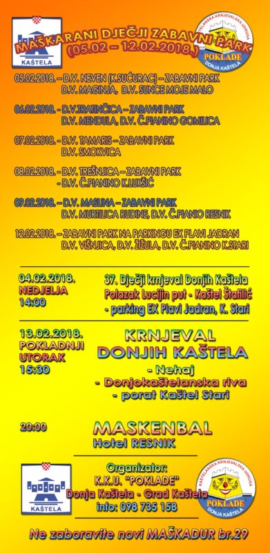 Dičji krnjeval u Donjim selim , u organizaciji KKU ”Poklade” na rasporedu je 04.veljače u 13:00 sati. Povorka kreće iz Lucijinog puta, preko rive do ex Plavog Jadrana. Krnjeval Donjih Kaštela je 13.veljače s početkom u 15:30 sati. Povorka po tradiciji ide preko donjokaštelanske rive do porta u Kaštel Starom. Istu tu večer u 20:00 održat će se maskenbal u hotelu Resnik, uz muziku uživo.