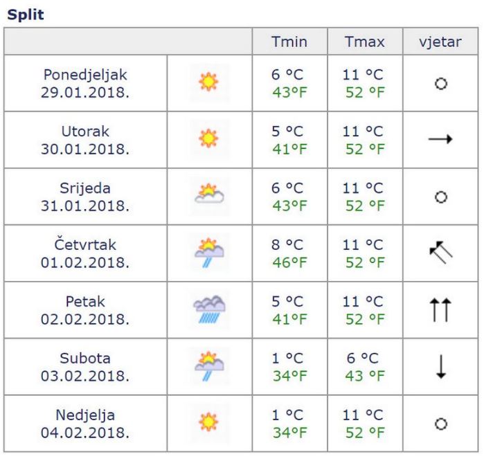 Jutros smo se u nizinama u unutrašnjosti probudili uz maglu, no poslijepodne se očekuje razvedravanje, pa će ponegdje zasjati i sunce. Najviša dnevna temperatura većinom će biti između 9 i 14 °C, a u krajevima s dugotrajnom maglom niža.