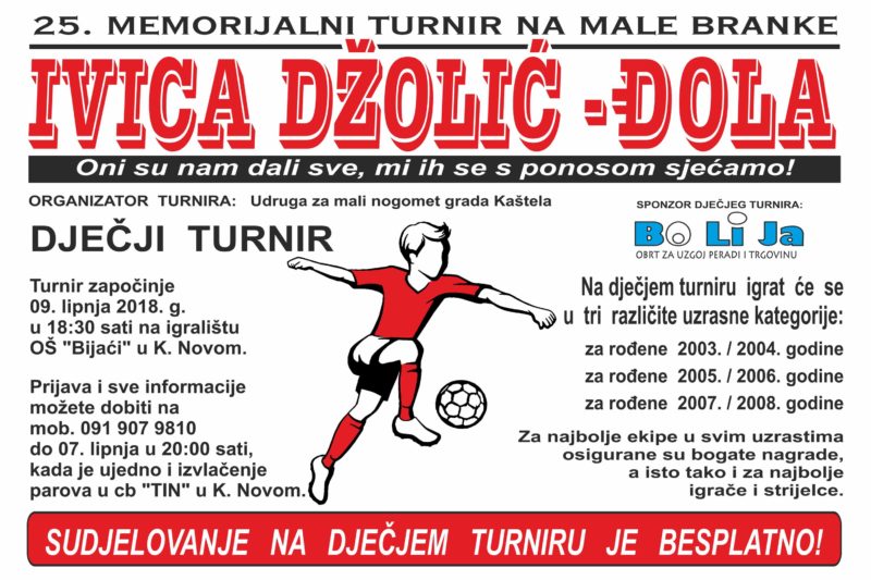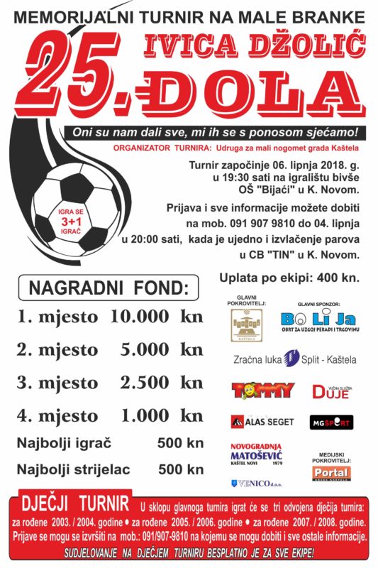 Godine brzo prolaze, tako je i naš Memorijalni turnir na male branke ‘Ivica Džolić – Đola’ došao do svog 25. jubilarnog izdanja. Turnir koji se već 25. godinu za redom igra u spomen na sve poginule branitelje Grada Kaštela i općina kaštelanske zagore u organizaciji Udruge za mali nogomet grada Kaštela te uz pokroviteljstvo Grada Kaštela ove će godine početi nešto ranije nego što je uobičajeno, u srijedu 06. lipnja na igralištu stare/bivše O.Š. ‘Bijaći’ u Kaštel Novom.