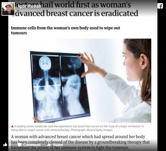 Hrvatski znanstvenik Igor Rudan, s adresom u Edinburghu u Velikoj Britaniji, oduševljen je vijestima iz SAD-a – eksperimentalnom metodom imunoterapije liječnici su uspjeli spasiti ženu s uznapredovalim, agresivnim oblikom raka dojke.