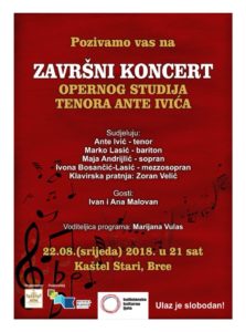 U sklopu Kaštelanskog kulturnog ljeta , Turistička zajednica grada Kaštela organizira koncert Ante Ivića i prijatelja. Na brcu u Kaštel Starom, 22.8. u 21:00 h , nastupit će tenor Ante Ivić uz klavirsku pratnju te sopran Maja Andrijolić , bariton Marko Lasić te mezosopran Ivona Bosančić Lasić. Voditeljica programa je Marijana Vulas.