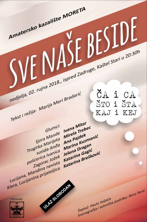 Kaštelansko Amatersko kazalište Moreta, 02. rujna (nedjelja s početkom u 20:30h (ispred Zadruge u K. Starom), izvesti će predstavu Sve naše beside.