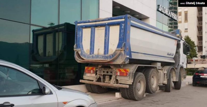Vlasnik građevinske tvrtke Bešlić je jutros oko 7 sati blokirao kamionima ulaze u zgradu Jadranskog osiguranja na splitskom Kmanu.