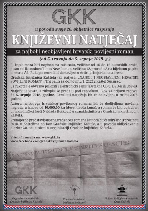 U sklopu obilježavanja svoje 20. obljetnice, Gradska knjižnica Kaštela raspisala je Natječaj “Najbolji neobjavljeni hrvatski povijesni roman”.