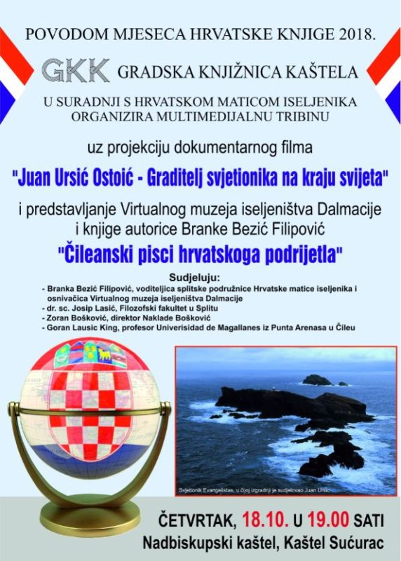 U sklopu Mjeseca hrvatske knjige 2018., čija je tema ove godine kulturna baština Gradska knjižnica Kaštela u suradnji s Hrvatskom maticom iseljenika organizira Multimedijalnu tribinu s Brankom Bezić Filipović uz projekciju dokumentarnog filma “Juan Ursić Ostoić – Graditelj svjetionika na kraju svijeta” i predstavljanje Virtualnog muzeja iseljeništva Dalmacije i knjige autorice Branke Bezić Filipović “Čileanski pisci hrvatskoga podrijetla” u četvrtak, 18. listopada u 19.00 sati u Nadbiskupskom kaštelu, na adresi Gospojska štrada 1 u Kaštel Sućurcu.