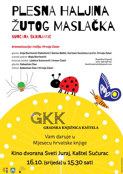 Povodom Mjeseca hrvatske knjige Gradska knjižnica Kaštela daruje svim polaznicima kaštelanskih dječjih vrtića, prvašićima i učenicima nižih razreda osnovne škole, kao i svim mlađim članovima GKK predstavu “Plesna haljina žutog maslačka”. Predstavu će Kazalište Prijatelj odigrati u srijedu 16. 10. u 15.30 sati u Kino dvorani svetog Jurja u Kaštel Sućurcu.