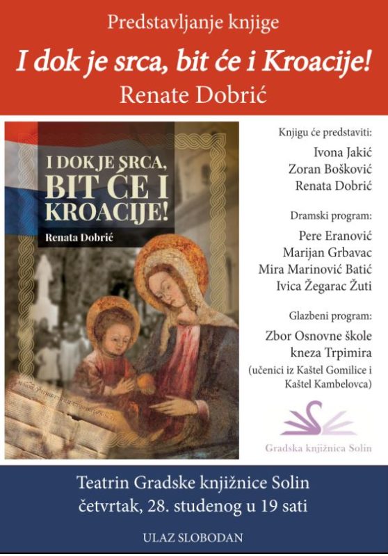 Gradska knjižnica Solin u četvrtak 28. studenoga u 19 sati u Teatrinu organizira predstavljanje knjige Renate Dobrić “I dok je srca, bit će i Kroacije!” u izdanju Naklade Bošković iz Splita.