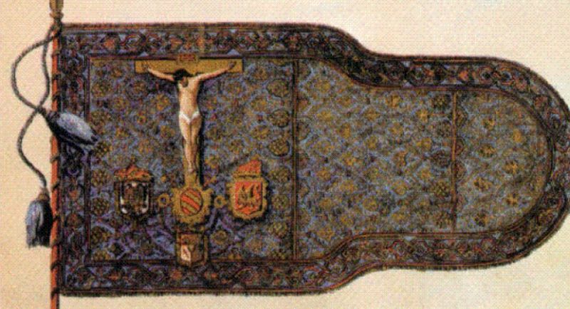 Zastava Svete lige korištena tijekom bitke kod Lepanta: dominira raspeti Krist iznad grbova tadašnjeg pape Pija V., dvojice Habsburgovaca (Karla V. i Don Juana Austrijskog) te državnog znakovlja Mletačke Republike. Heraldička znamenja su međusobno povezana lancima što simbolizira savez.