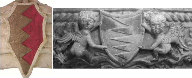 Osim aplicirane na zastavama grbove često nalazimo i u različitim segmentima arhitekture: model grba obitelji Cipiko (Muzej grada Kaštela) – izvornik se nalazi u kuli u Kaštel Novom; dva anđela kao heraldički držači grba na fragmentu gotičkog kamina iz trogirske palače Cipiko
