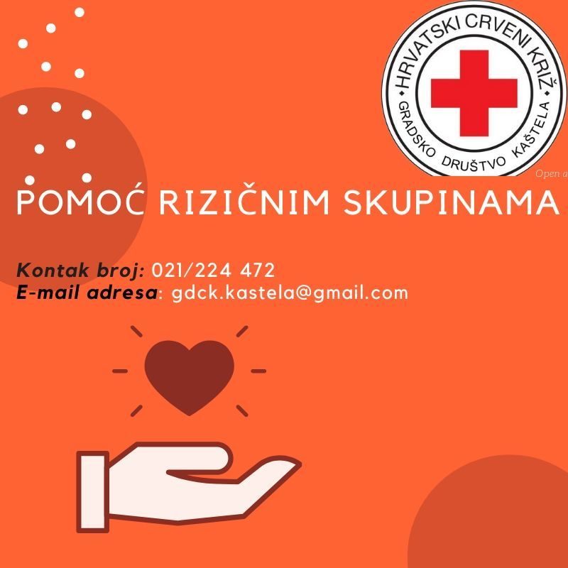 Gradsko društvo Crvenog križa Kaštela u skladu s mogućnostima i potrebama građana organizirat će dostavu osnovnih prehrambenih i higijenskih potrepština osobama koje su u najvećem riziku od obolijevanja koronavirusom. Svoje potrebe stariji sugrađani mogu prijaviti putem telefona 021/224-472 od ponedjeljka do petka od 8.00 do 15.00 sati.