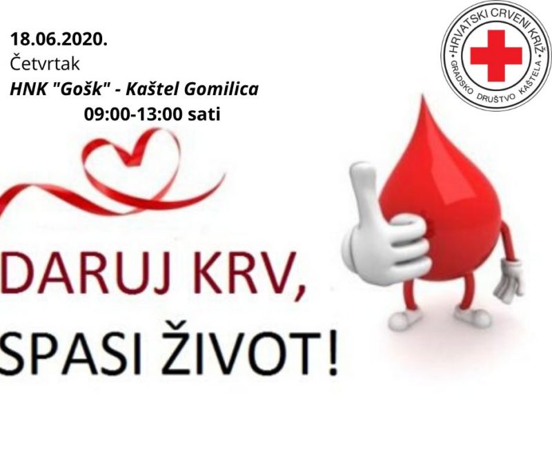 Klub dobrovoljnih darivatelja krvi Adriachem i Gradsko društvo Crvenog križa Kaštela, u četvrtak 18. lipnja organiziraju još jednu akciju dobrovoljnog darivanja krvi, koja će se u vremenu od 8 do 13 sati, održati u prostorijama HNK Gošk u Kaštel Gomilici.