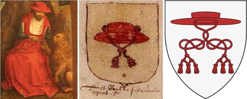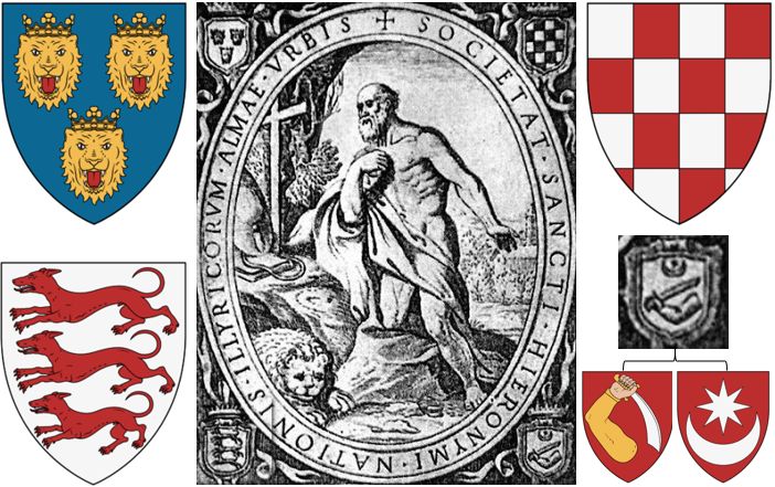 Prikaz sv. Jeronima – s prepoznatljivim kardinalskim šeširom – kako vadi trn iz lavlje šape. Vrlo sličan oblik turnirskog šešira nalazimo u heraldičkom znamenju tzv. Slavenske marke (Windische Mark, jugoistočni dio današnje Slovenije), kao npr. u zbirci grbova Universeel wapenboek (oko 1558.), dok je u Sutješkom rodoslovlju (oko 1585.) taj grb pripisan „Kraljevini Slovinskoj“.