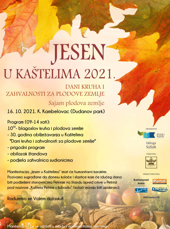 Manifestacija „Jesen u Kaštelima“ imat će i ove godine humanitarni karakter. Stoga pozivamo sve one koji će sudjelovati, građane grada Kaštela, vlasnike pekara i sve sudionike manifestacije,da donesu kolače i slastice koje će idućeg dana biti podijeljene građanima u Petrinji na štandu ispred crkve na kojem će pisati „Kaštela Petrinji s ljubavlju“ (kolači moraju biti upakirani). Ovom gestom želimo stanovnicima Petrinje pokazati da nisu sami i da još uvijek mislimo na njih.