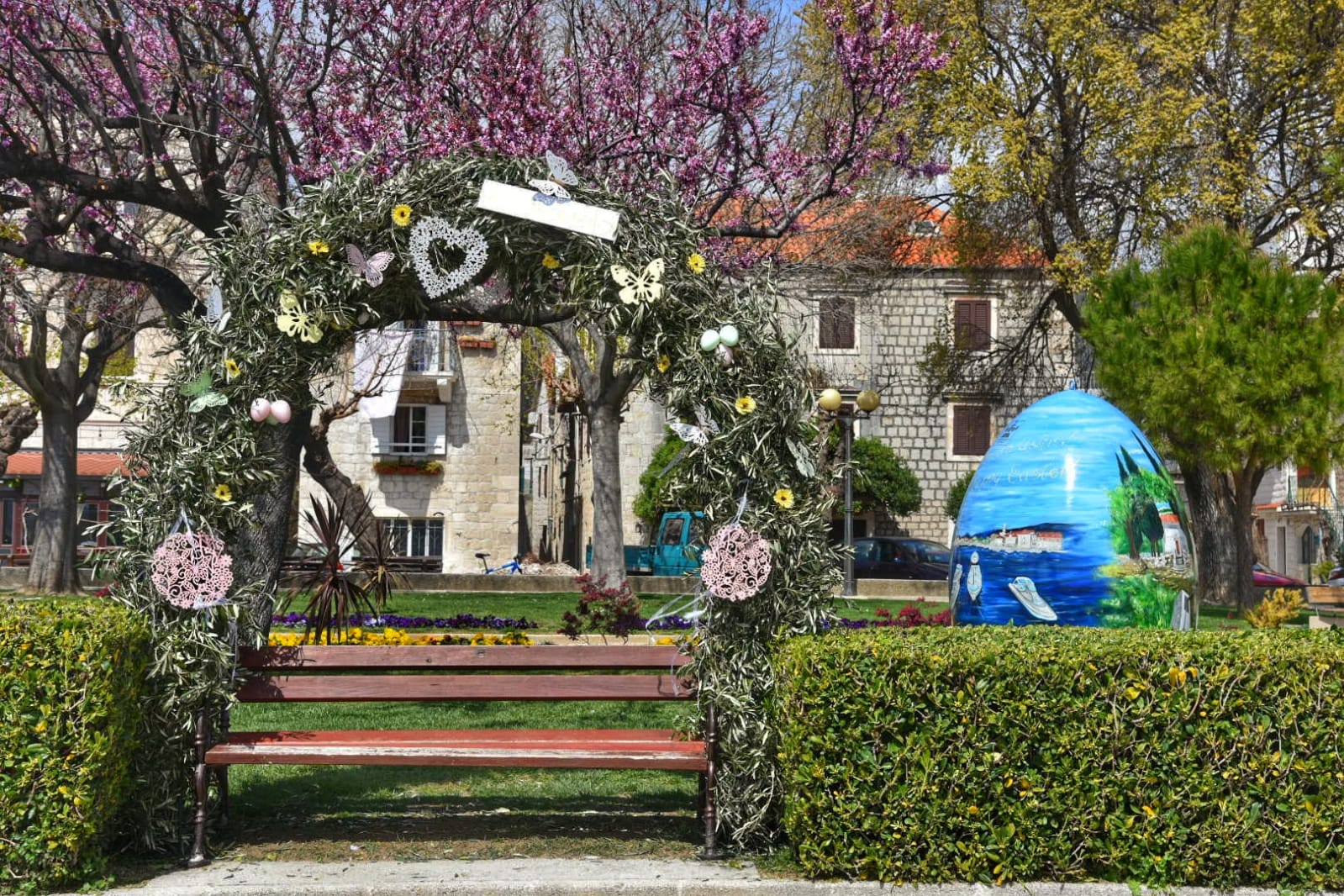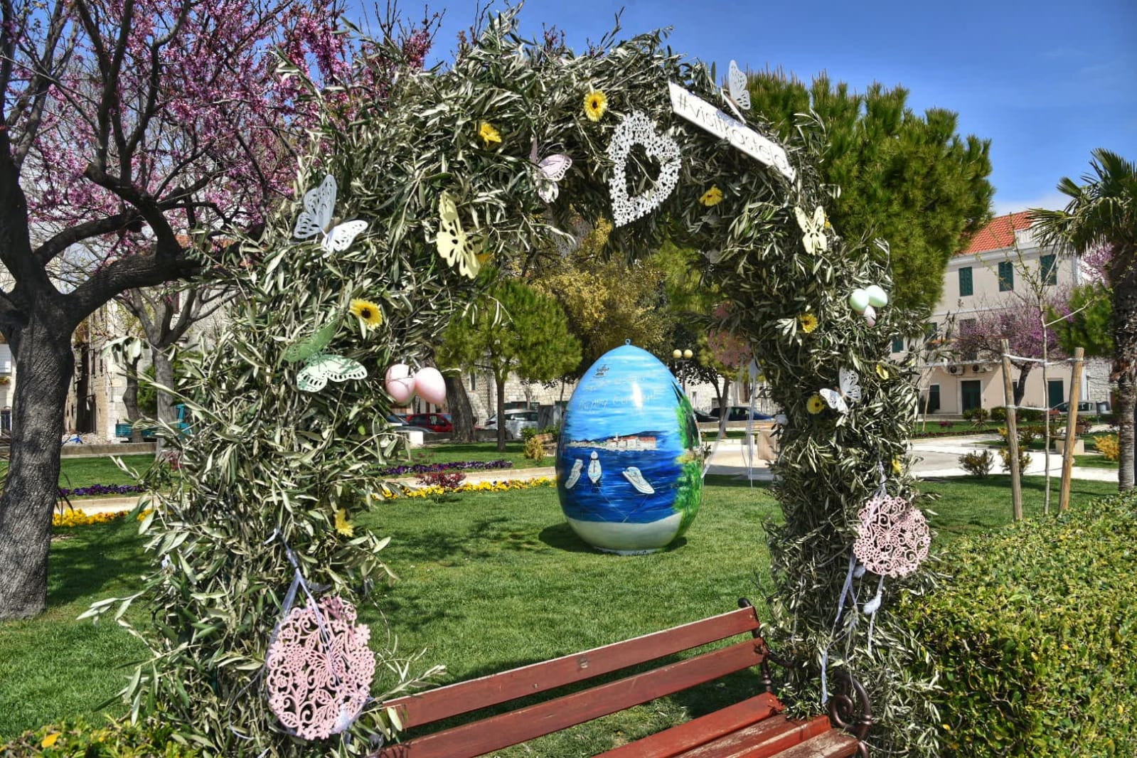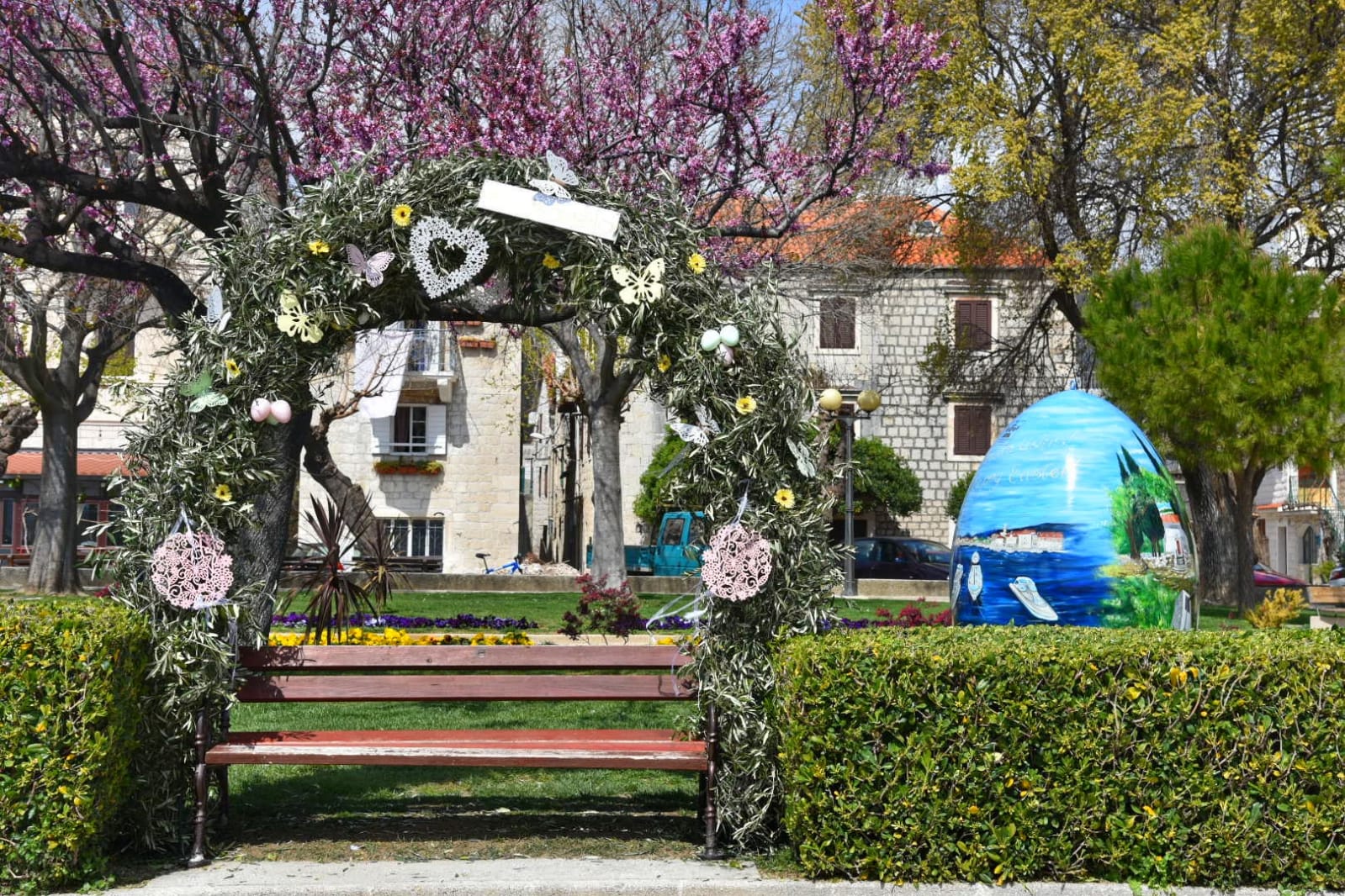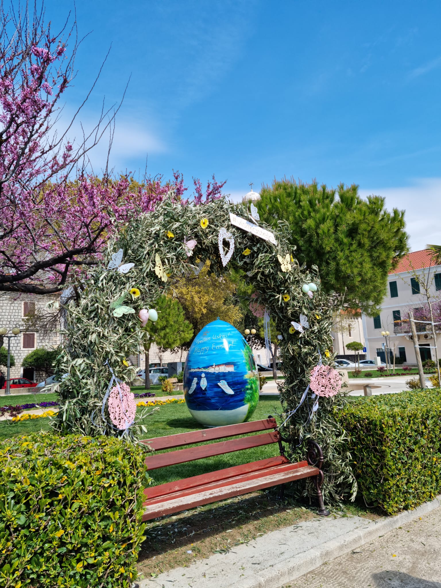 Kako smo već pisali Turistička zajednica grada Kaštela, prije nekoliko dana ukrasila je kaštelanske parkove uskršnjim pisanica. Danas su otišli korak naprijed te u đardin u Kaštel Novom postavili vijenac od maslinovih grančica.