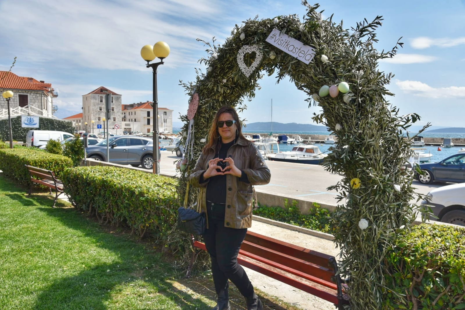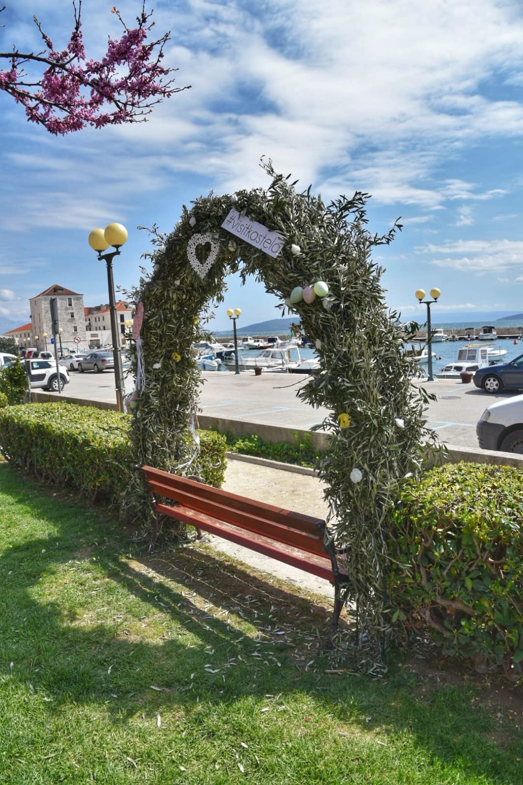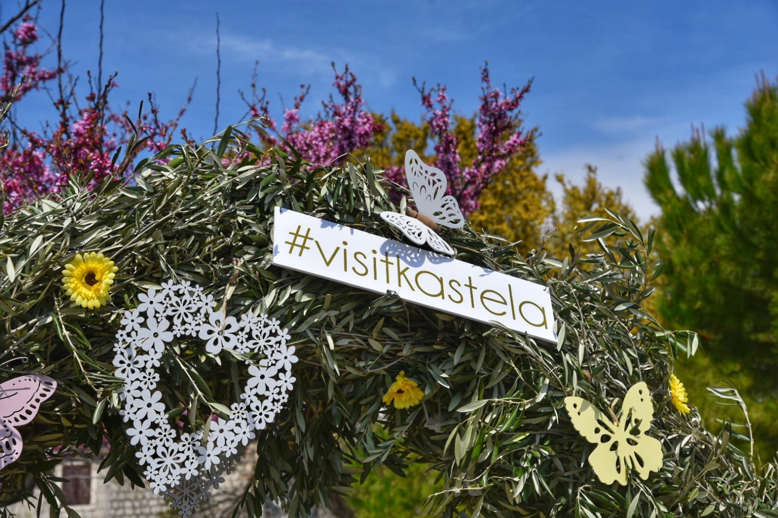 Vjerujemo kako će ovo mjesto bili glavna baza za instagramske fotke uz obavezni #visitkastela. Vijenac je dvostruk, tj. ukrašen s obje strane, te s jedne strane na fotkama možete imati prekrasne uskršnje pisanice i crkvu Sv. Petra Apostola, a s druge strane plavetnilo mora. Vijenac je dekoriran prigodno za uskršnje blagdane, a nakon toga ukrase će zamijeniti te postaviti prigodne sezonske. Radujemo se fotografijama koje će načiniti svi gosti koji će ove turističke sezone posjetiti Kaštela te u svijet prenijeti ljepotu sedam bisera.