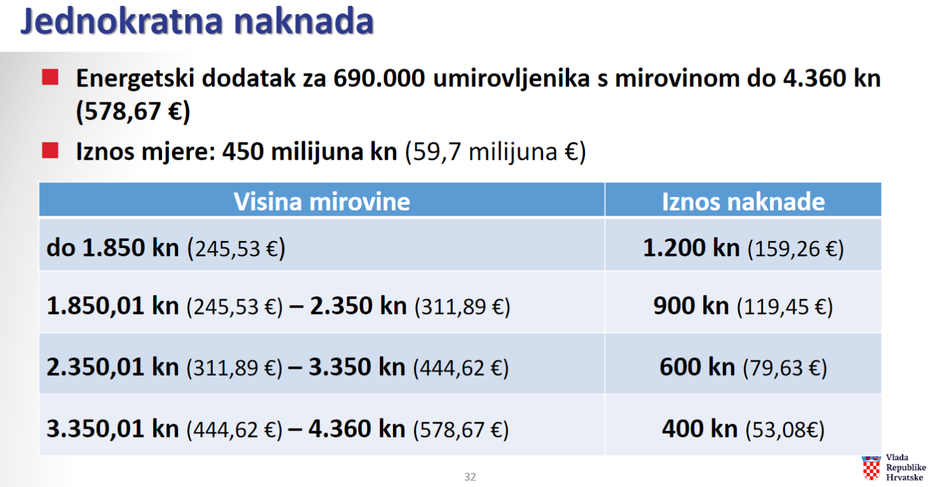 Vlada je u svibnju ove godine već isplatila energetski dodatak za više od 633.000 umirovljenika, a sljedeća isplata energetskog dodatka obuhvatit će još više umirovljenika, njih gotovo 689.000. Naime, podignuti su cenzusi za isplatu, pa će dodatak dobiti i oni s mirovinama od 4.360 kuna.
