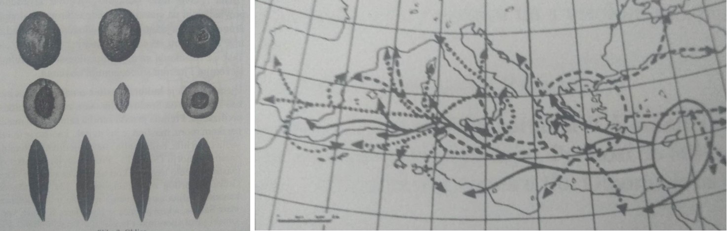Karakteristike masline oblice – uz udio ulja u plodu (oko 21 %) svrstava se u uljne sorte; Pravci širenja uzgoja masline na području Sredozemlja, uključujući i današnje hrvatske krajeve (I. Kovačević, S. Perica; „Maslinarstvo u Kaštelima“, 1998.)