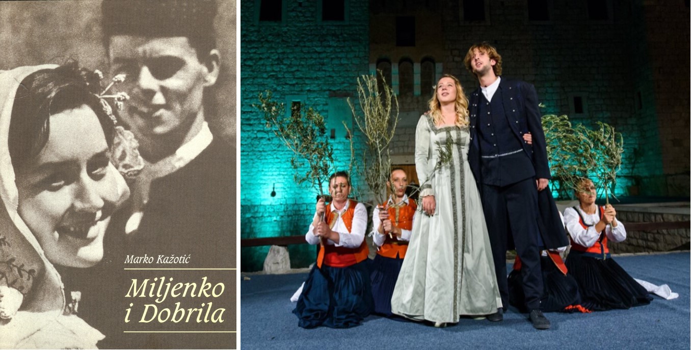 Kaštelanska predaja o Miljenku i Dobrili, koju je prvi zapisao Trogiranin Marko Kažotić (lijevo) govori da su očevi obitelji Rušinić (Rosani) i Vitturi, iz kojih su potekli Miljenko i Dobrila, bili u svađi oko prava na mljevenje maslina (scenski prikaz legende o Miljenku i Dobrili ispred dvorca Vitturi, uz Kaštelanke s granama maslina u rukama)
