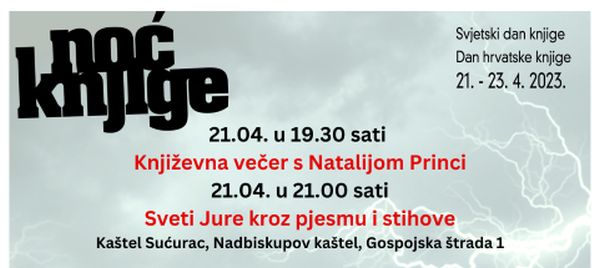 Gradska knjižnica Kaštela i ove godine u Noći knjige organizira razna događanja za djecu i odrasle u svim knjižničnim odjelima, s tim da će se glavno događanje održati u petak 21. travnja u Nadbiskupovom kaštelu (Biskupova palača) u Kaštel Sućurcu s početkom u 19.30 sati.