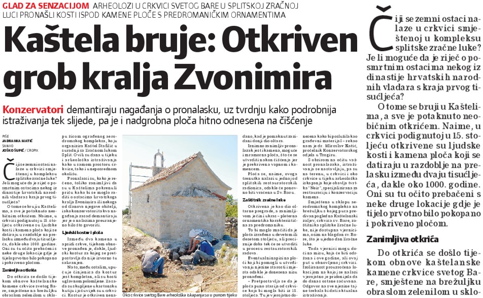 Članak o kaštelanskoj arheološkoj „senzaciji“ u tadašnjem tisku (Slobodna Dalmacija, 6. svibnja 2011.)