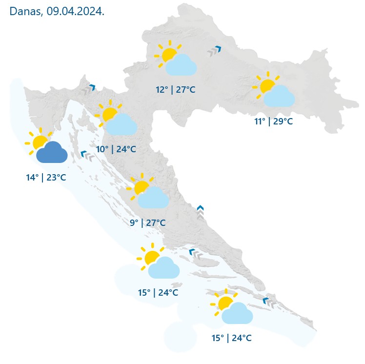 Prema prognozi DHMZ-a, danas se očekuje pretežno sunčano, na zapadu zemlje prema kraju dana s više oblaka. Puhat će slab i umjeren jugozapadni i južni vjetar, na Jadranu većinom umjereno jugo. Najviša dnevna temperatura bit će od 25 do 30, duž obale i na otocima te u gorskoj Hrvatskoj između 21 i 26°C.