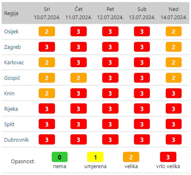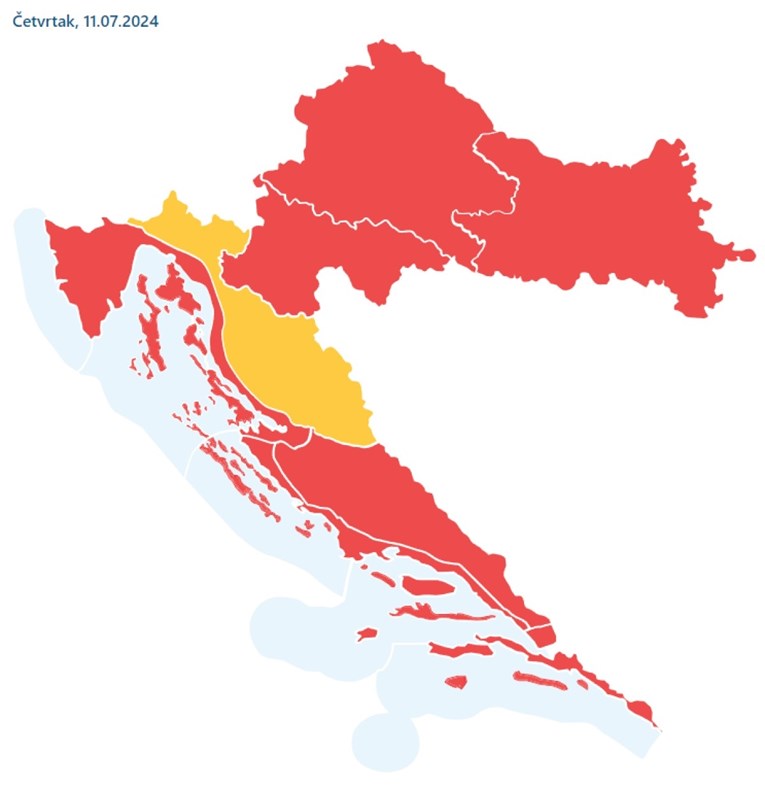 Za sve regije osim gospićke objavljeno je crveno upozorenje na iznimno visoke temperature. Za gospićku regiju je objavljeno narančasto upozorenje.