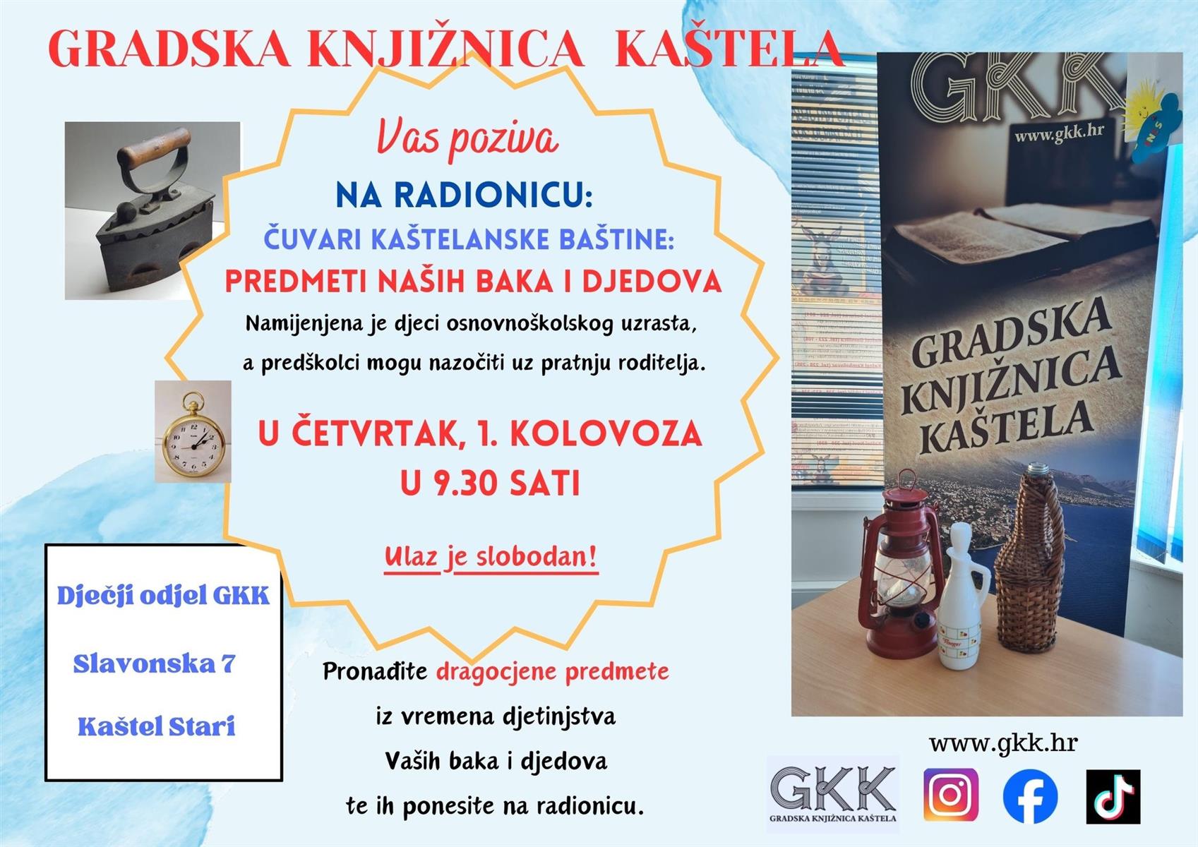 Pridružite nam se na ovotjednoj zabavno-obrazovnoj radionici „Čuvari kaštelanske baštine – stari kućanski predmeti naših baka i djedova“ koja će se održati u četvrtak, 1. kolovoza u Dječjem odjelu GKK u Kaštel Starom s početkom u 9.30 sati.