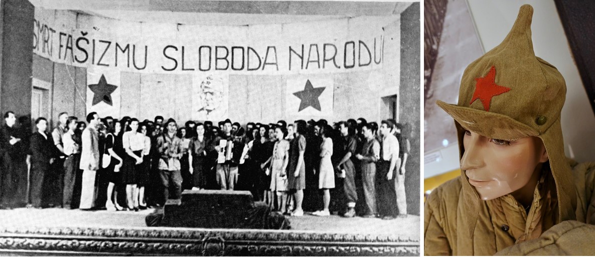 U Splitu – oslobođenom talijanske vlasti – kulturno-prosvjetni odsjek NOO Splita je 21. rujna 1943. u kazalištu organizirao priredbu, koja je započela hrvatskom himnom – „Lijepom našom“. Ispod slogana se uočavaju velike zvijezde petokrake, kao i na kapi „maršala“ Tita. Naime, crvena zvijezda petokraka je korištena na partizanskim kapama koje su svoj uzor imale u kapama vojnika Crvene armije, što upućuje na uzore iz tadašnjeg totalitarnog (staljinističkog) SSSR-a; Crvena zvijezda petokraka na osobitoj kapi „budenovki“ vojnika Crvene armije