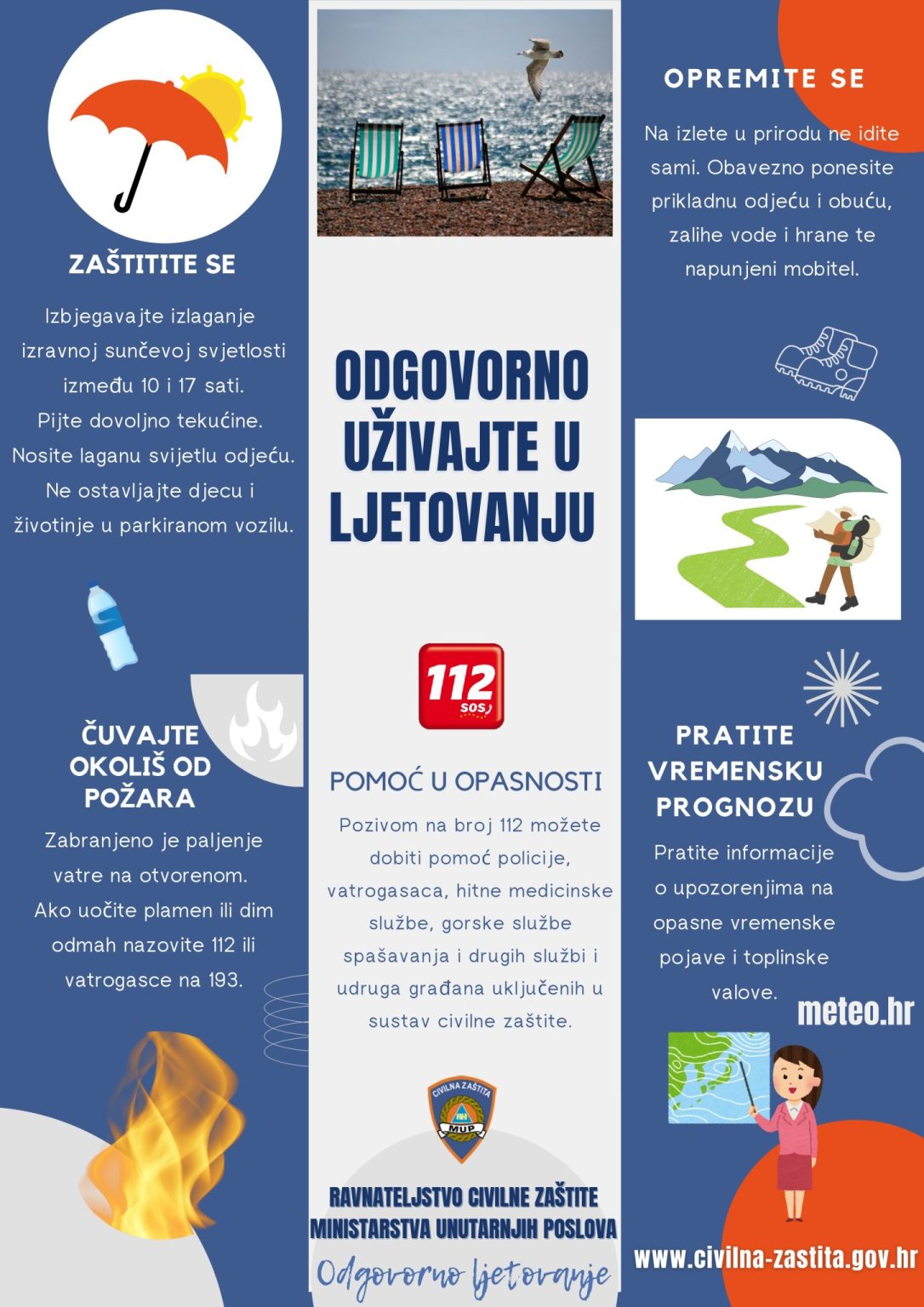 Kako bi građane i turiste pravovremeno i kvalitetno informirali o odgovornom ponašanju i pravilnim reakcijama tijekom ljetnih mjeseci, Ravnateljstvo civilne zaštite i ove godine nastavlja s kampanjom „Odgovorno ljetovanje“, koja građanima i posjetiteljima Hrvatske pruža kratke savjete i preporuke za odgovorno ponašanje i izbjegavanje potencijalno opasnih i izvanrednih situacija.
