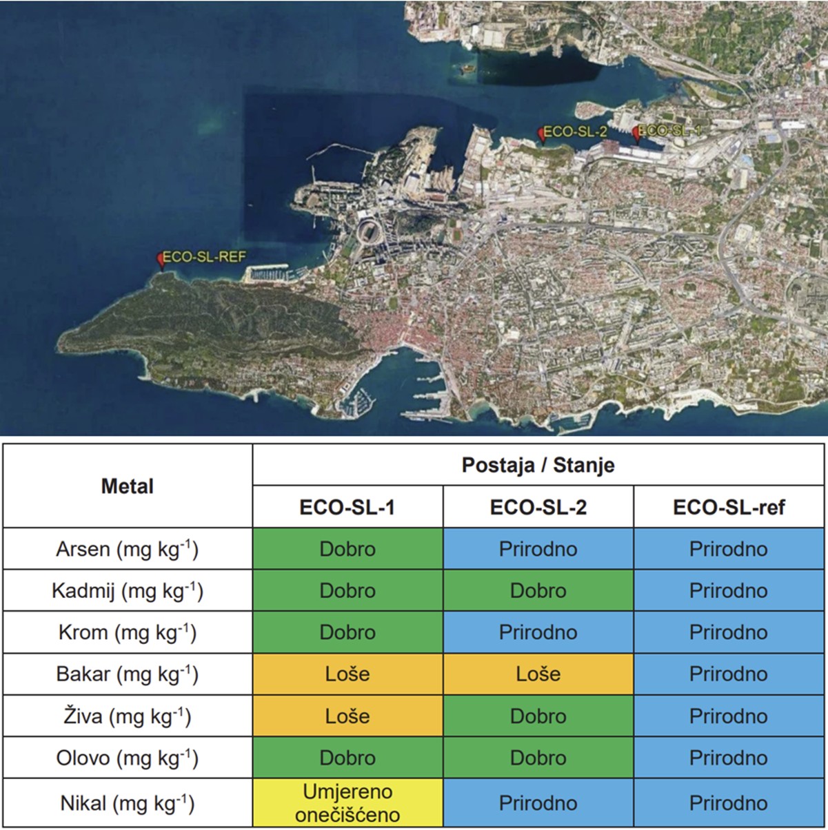 S druge, jadranske strane mora, Institut za oceanografiju i ribarstvo u suradnji s Institutom Ruđer Bošković je 2023. ispitao koncentraciju teških metala i arsena u morskoj vodi, sedimentu i tkivu školjkaša na području Kaštelanskog zaljeva. Istraživanje je potvrdilo kako je šire područje ovog zaljeva još uvijek onečišćeno živom zbog nekadašnje tvornice PVC-a „Adriachem“. Tako su tri desetljeća nakon prestanka rada tog postrojenja, koncentracije tog metala i dalje povišene uslijed akumulacije i taloženja u sedimentu!