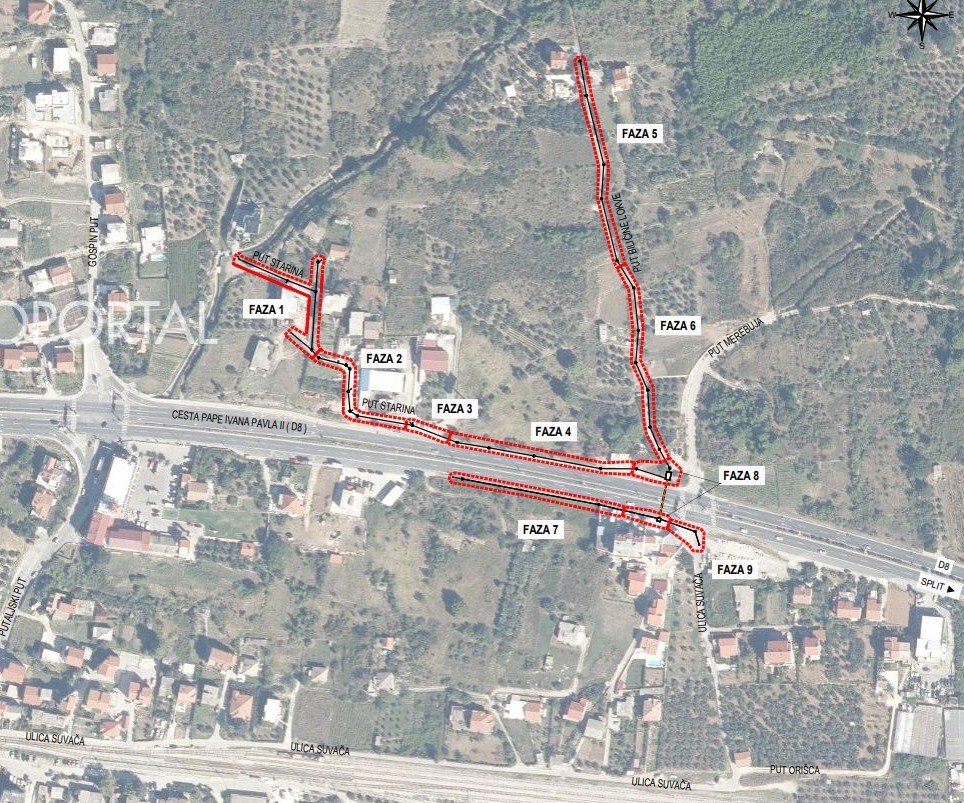 Projekt će se realizirati u devet faza, počevši od kućnog broja Biličine lokve 19, prema preglednoj situaciji definiranoj u dokumentu „Privremena regulacija prometa za vrijeme radova na sustavu odvodnje otpadnih voda na Putu Starina, Kaštel Sućurac“.