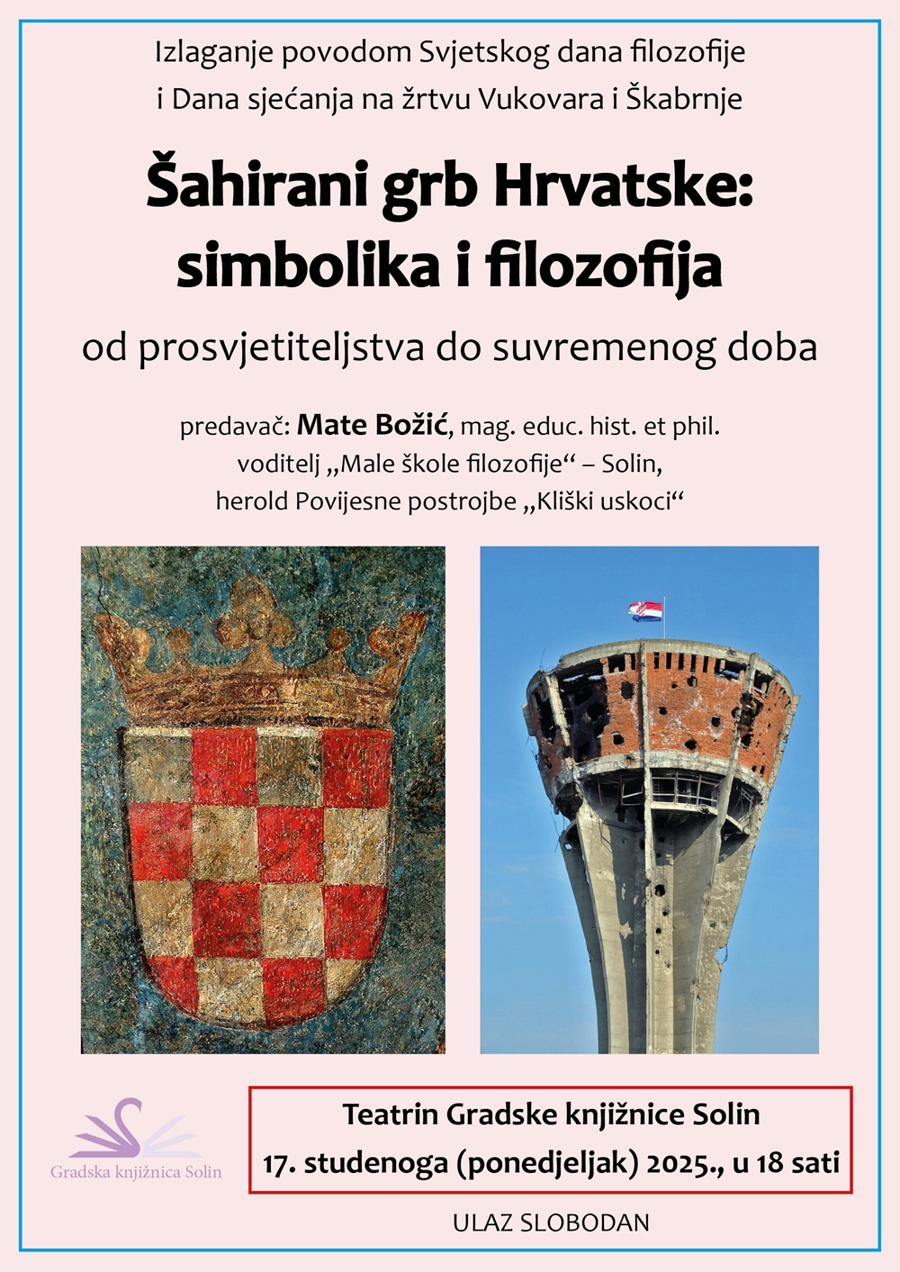 O svemu tome publika će imati priliku čuti nešto više u ponedjeljak (17. studenoga) u Gradskoj knjižnici Solin povodom Svjetskog dana filozofije i uoči nadolazećeg Dana sjećanja na žrtvu Vukovara i Škabrnje, u okviru izlaganja pod naslovom: „ŠAHIRANI GRB HRVATSKE: SIMBOLIKA I FILOZOFIJA, od prosvjetiteljstva do suvremenog doba“. Izlaganje će održati Mate Božić, voditelj „Male škole filozofije“ – Solin i herold „Kliških uskoka“, ujedno jedan od sudionika znanstvenog skupa Hrvatske akademije znanosti i umjetnosti na kojem je donesena Deklaracija o hrvatskom povijesnom grbu.