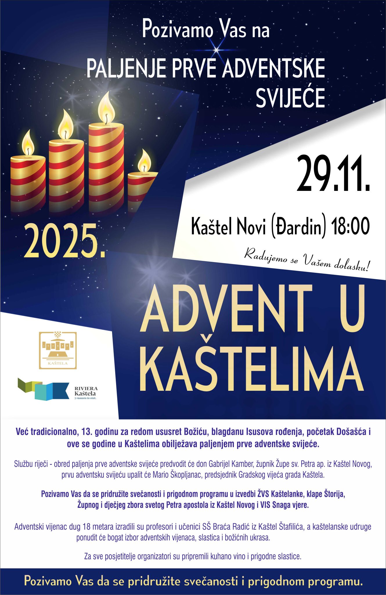 Tradicionalni početak Adventa u Kaštelima obilježava se paljenjem prve adventske svijeće. Obred i prigodni program vodit će don Gabrijel Kamber, župnik Župe sv. Petra, a prvu svijeću upalit će Mario Škopljanac, predsjednik Gradskog vijeća grada Kaštela.