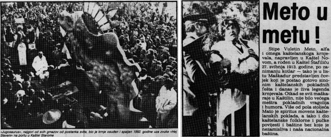 Isječci iz članka „Slobodne Dalmacije“ o Stipi Vuletinu – fotografija spaljivanja krnje „Jugosaurusa“ („najgori od svih gmazov od postanka svita“) 1992. i kratka Metina biografija (hgd-zrinski.hr) – Meto je na svom zadnjem krnjevalu 1990. godine nastupio u ulozi Kralja!